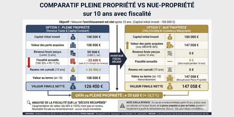 Comparons avec un investissement classique en pleine propriété. Avec 50 000€, Marc aurait touché 2 500€ bruts par an. Fiscalisé à 58,2%, il aurait perçu 1 045€ nets par an, soit 10 450€ sur 10 ans. Son capital serait resté à environ 50 000€ (en supposant une stabilité du prix de part).