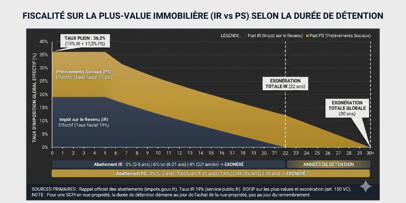 Avec l’abattement pour durée de détention (6% par an entre la 6e et la 21e année pour l’impôt sur le revenu, 1,65% par an dès la 6e année pour les prélèvements sociaux), votre plus-value nette imposable sera réduite. Après 10 ans de détention, vous bénéficiez de 24% d’abattement IR (4 ans au-delà de la 6e année × 6%) et de 6,6% d’abattement prélèvements sociaux (4 ans × 1,65%).