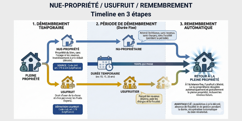 Conseil d’expert : Le terme juridique complet est « démembrement temporaire de propriété ». Temporaire est crucial : contrairement au démembrement viager (qui dure jusqu’au décès), ici, la date de fin est connue dès le départ.