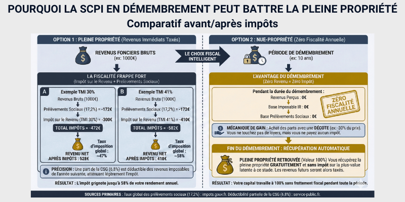 Imaginez acheter un bien immobilier avec 35% de réduction immédiate, sans payer aucun impôt sur les revenus ni sur la fortune pendant 10 ans. Aucune science-fiction fiscale, juste une mécanique légale que la majorité des investisseurs ignorent. La fiscalité française sur l’immobilier détruit le rendement réel. Un taux marginal d’imposition à 30% additionné aux 17,2% de prélèvements sociaux transforme un rendement brut de 5% en rendement net de 2,6%. Ajoutez l’IFI et vous comprenez pourquoi certains investisseurs cherchent désespérément des solutions ! Le démembrement temporaire de propriété n’est pas une niche juridique réservée aux ultra-riches. La SCPI en démembrement est l’outil le plus puissant pour les investisseurs fortement fiscalisés qui veulent capitaliser intelligemment.